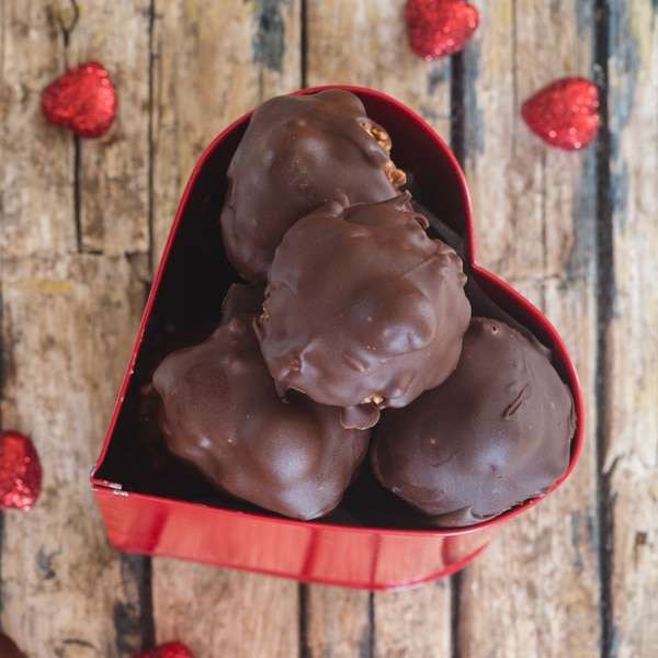 - Remove the mixture from the fridge and form into 14 balls, place them on a parchment paper lined cookie sheet or freezer safe plate, slightly flatten the top of each chocolate ball and place one whole hazelnut on each. Place the chocolates in the freezer for 30 minutes.