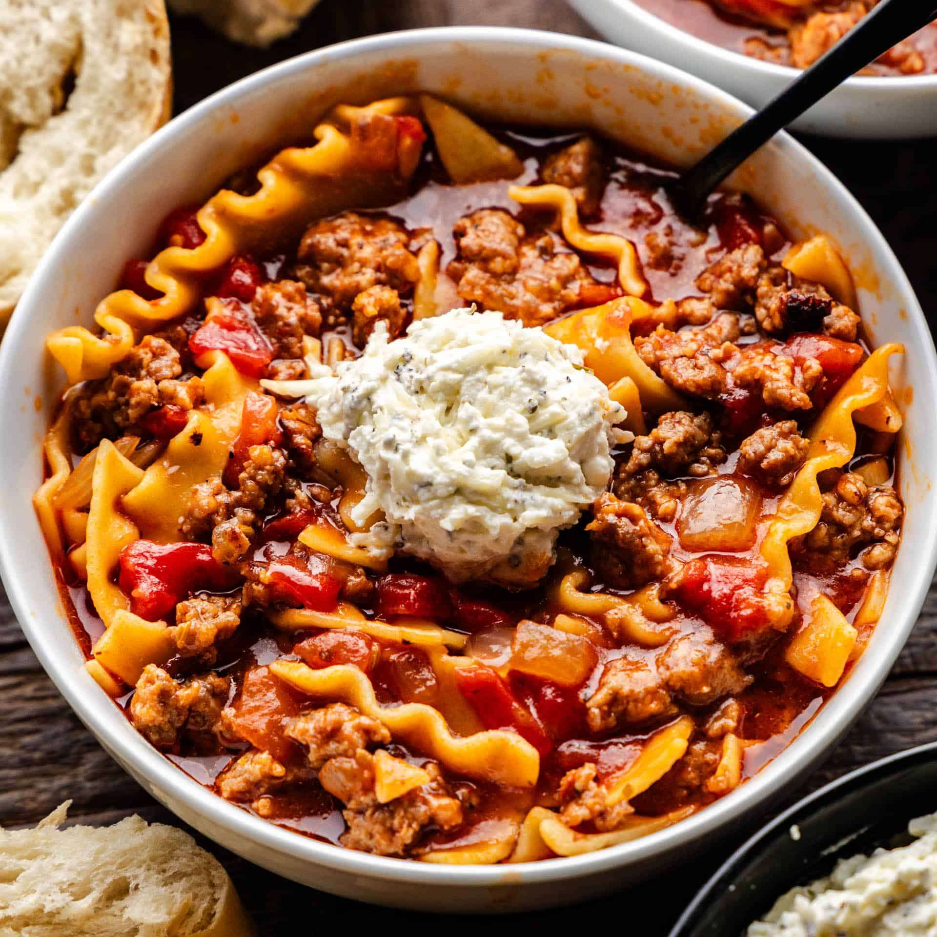 Enjoy all the flavors of homemade lasagna in soup form! This no-fuss, one-pot soup is ready in under an hour and topped with gooey cheese.