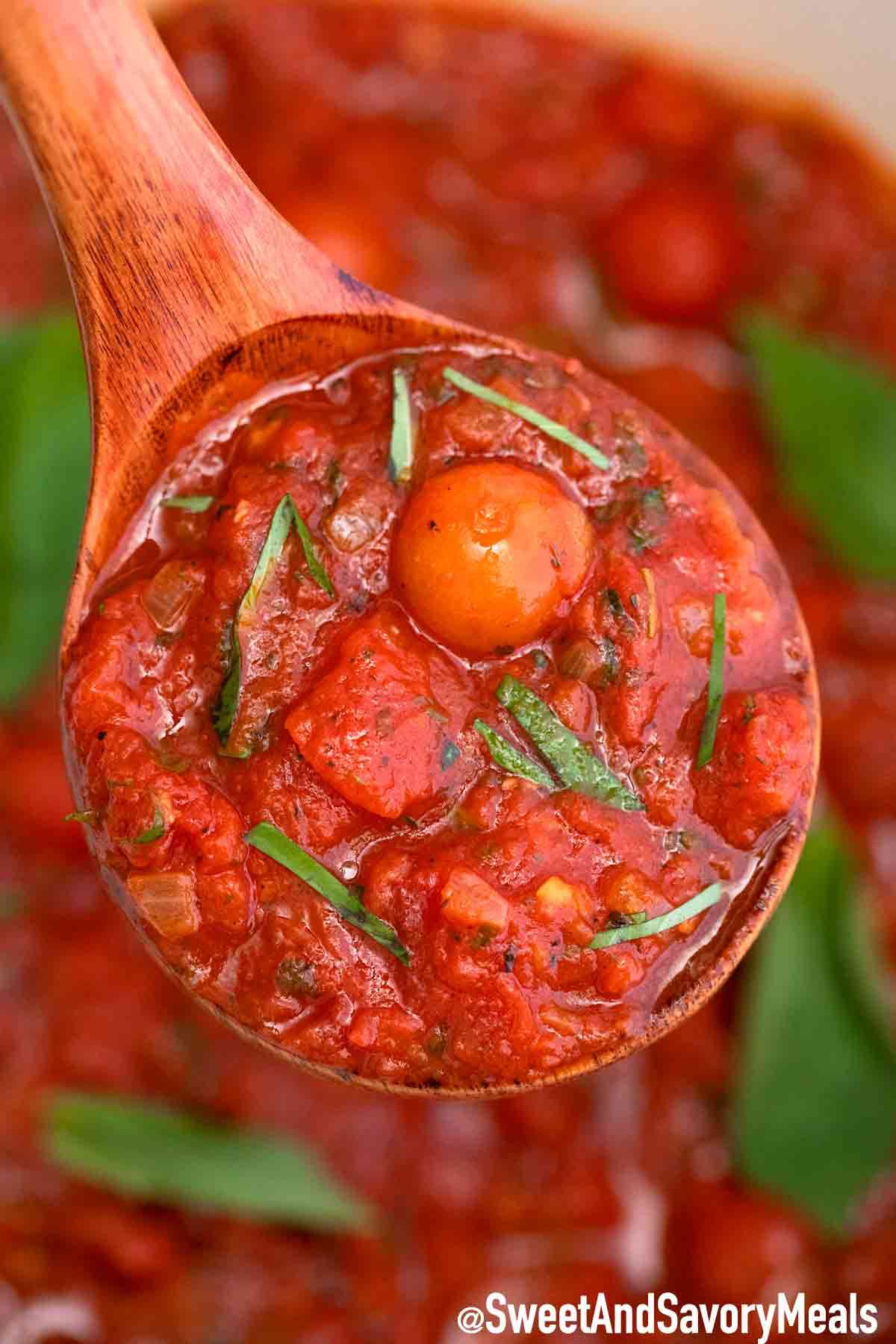 Homemade Marinara Sauce boasts fresh tomato flavors seasoned with herbs and aromatics. So easy, you can say goodbye to store-bought!