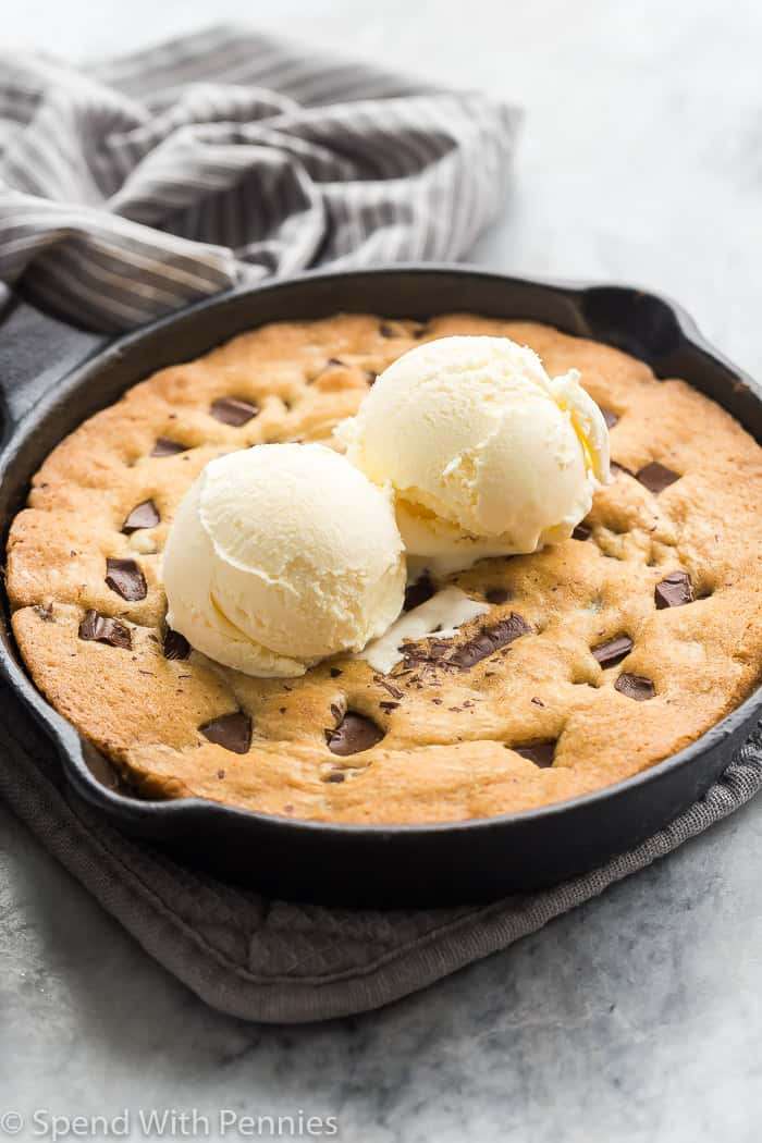 This easy Pizookie recipe is a homemade chocolate chip cookie, baked in a cast iron skillet until melty in the middle and crispy on the edges. Don't forget the ice cream!