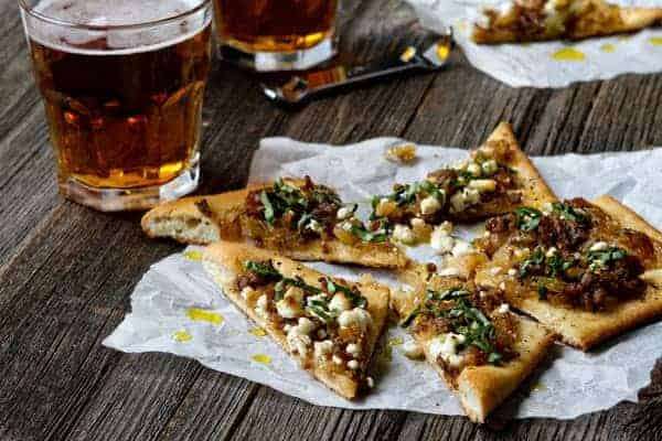 Homemade pizza with sausage, caramelized onions, crumbled goat cheese and fresh basil. You’ll never get delivery again!
