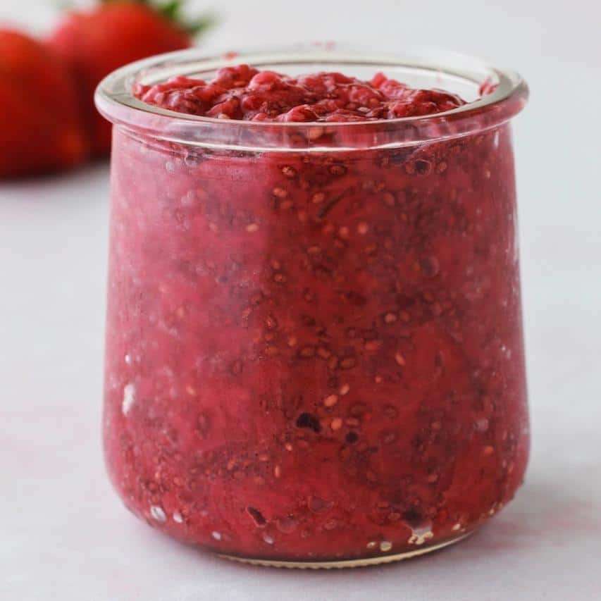 Easy homemade strawberry jam made with fresh strawberries, honey, chia seeds, and lemon juice.