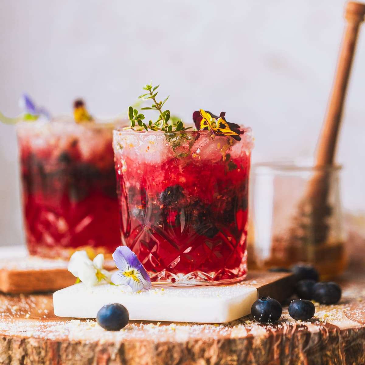 - In two double old fashioned glasses, muddle the blueberries, honey, thyme, and lemon juice to release the blueberry juices.