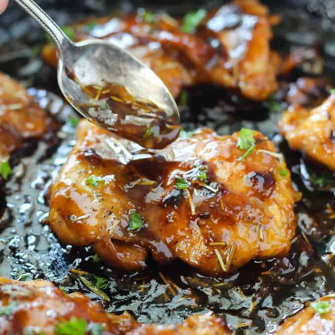 - Cook until chicken no longer pink and cooked through. Serve with the sauce from the pan spooned over the top of each thigh. Enjoy!