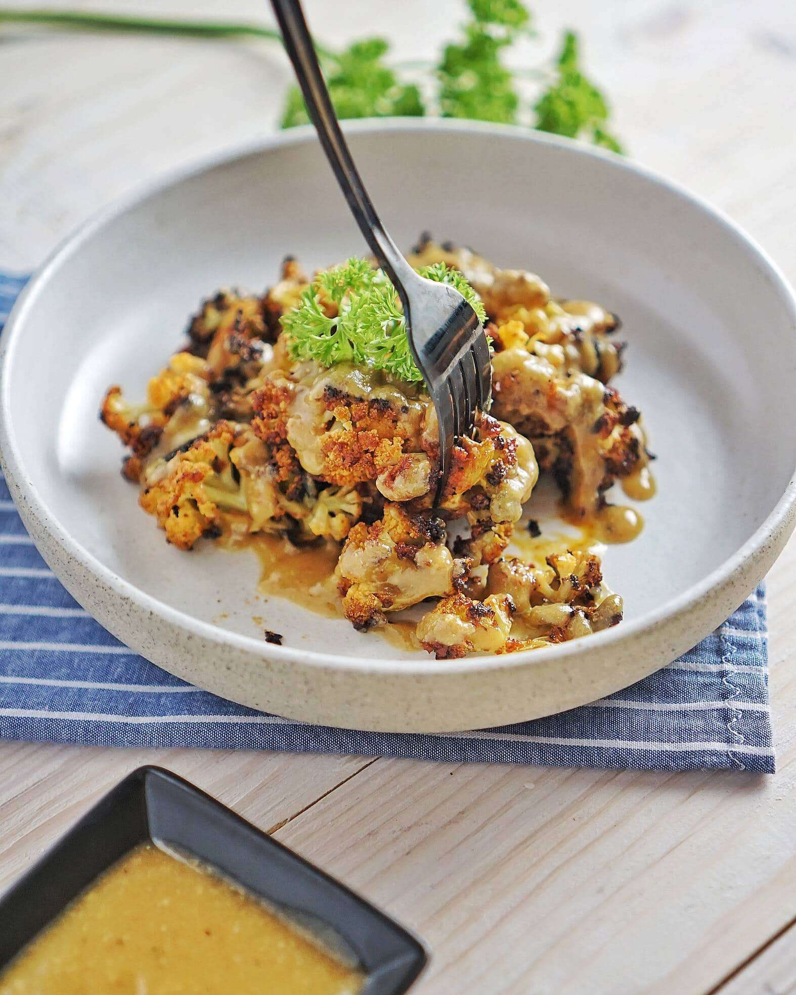 - Transfer the baked cauliflower into a serving platter and drizzle with the honey-tahini sauce right before serving.