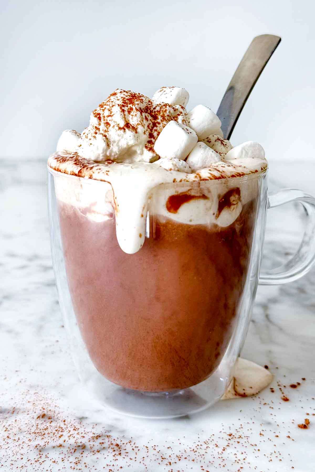 This simple hot chocolate recipe is a far cry from those sad packets you grew up on. It's creamy and decadent and is made with real chocolate instead of cocoa for the best chocolatey flavor.