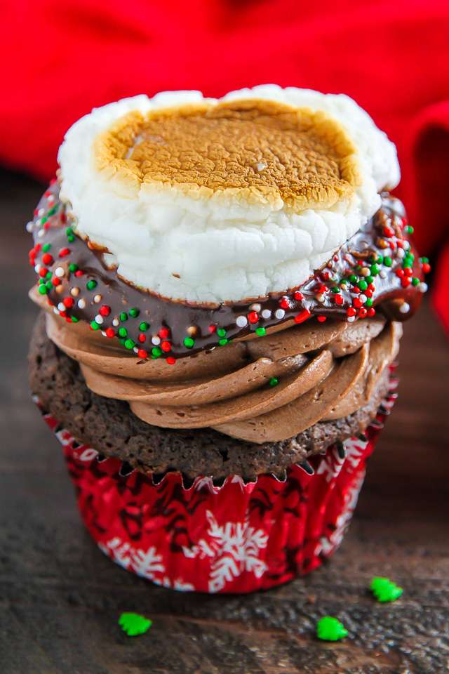 Super moist and decadent chocolate cupcakes topped with chocolate frosting, chocolate ganache, sprinkles, and a toasted marshmallow.
