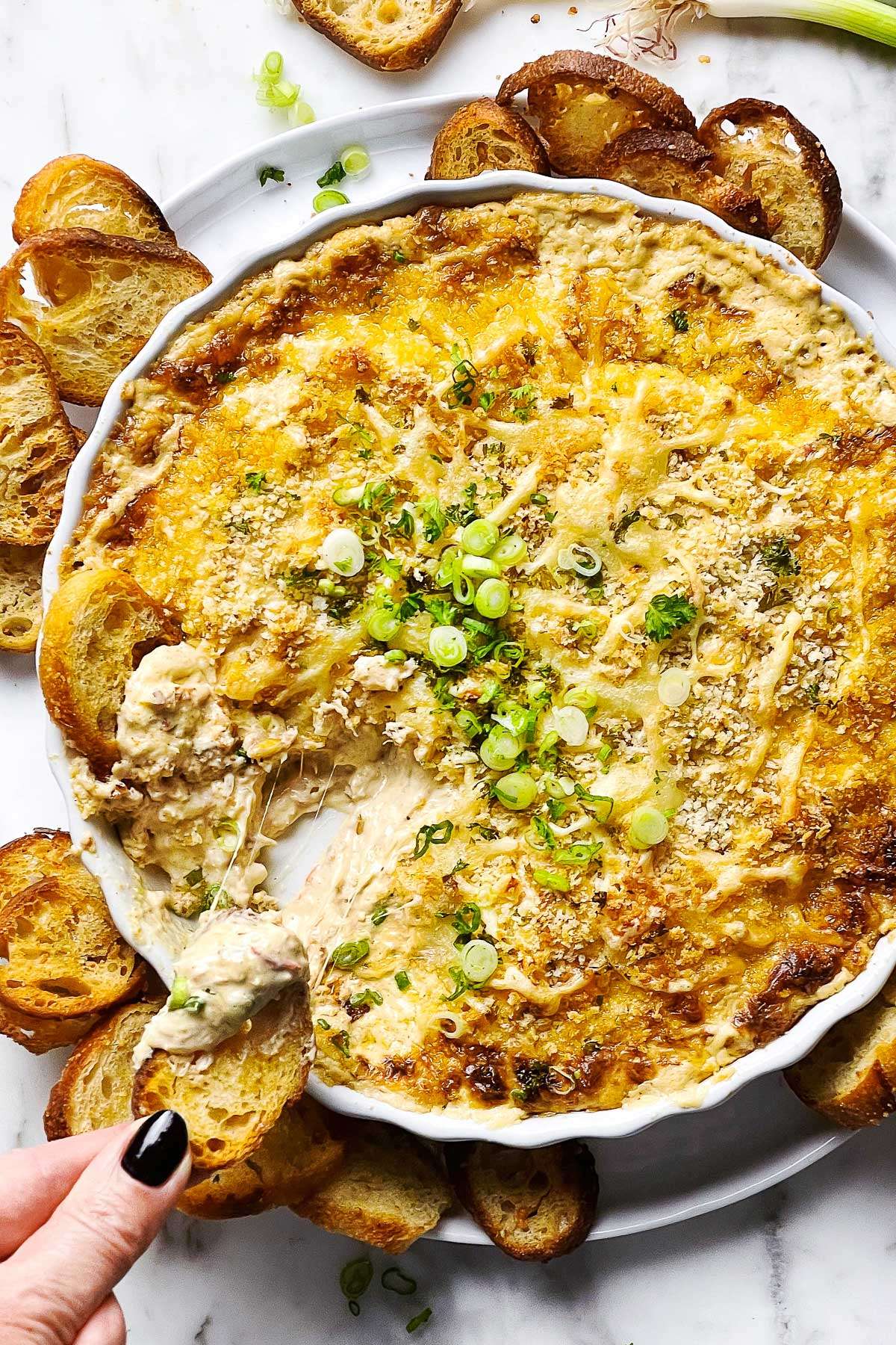 - Bake for 25-30 minutes or until golden. Serve hot with baguette slices, bagel crisps, or crackers.