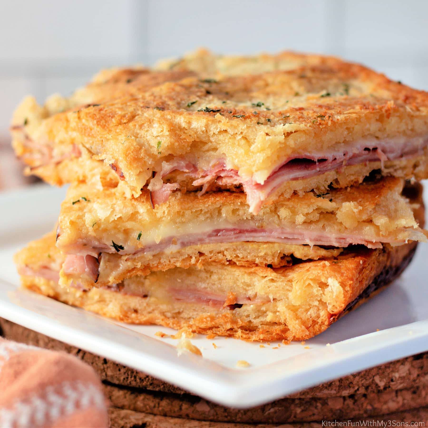 Baked Ham and Cheese Sandwiches are so delicious, you'll be finding any excuse to make them! Honey ham, dijon mustard, and pepper jack cheese sandwiched between golden brown baked crescent roll dough basted with butter--the perfect melty cheesy sandwich!