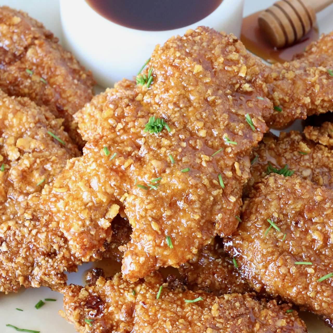 Make the best Hot Honey Chicken Crispers in the oven or air fryer! These crunchy chicken tenders are perfectly seasoned, coated in a delicious corn flake crust, baked or air fried to crisp perfection, then dipped in sweet and spicy hot honey sauce. The result is the most scrumptious chicken recipe ever!