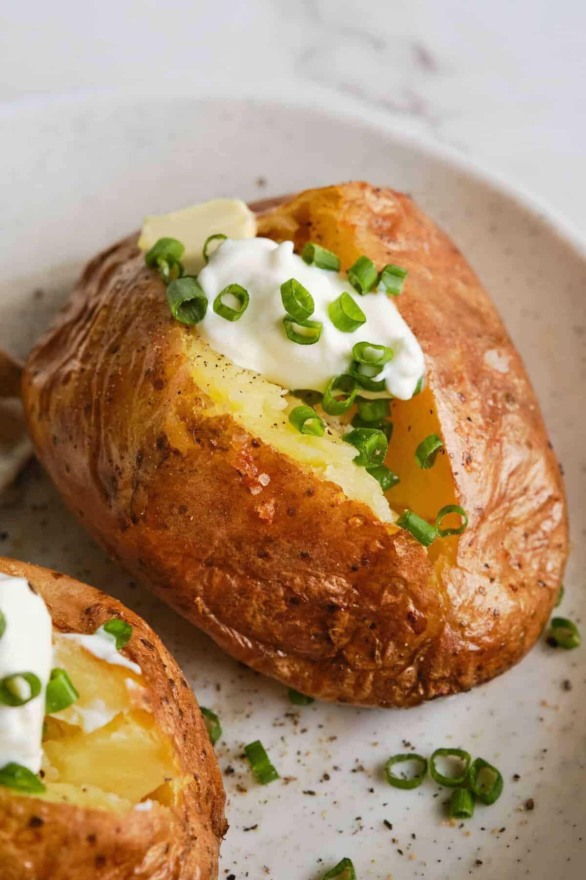 - Top each baked potato with a tablespoon of butter, a dollop of sour cream, if desired, and the chopped spring onions. Serve warm!