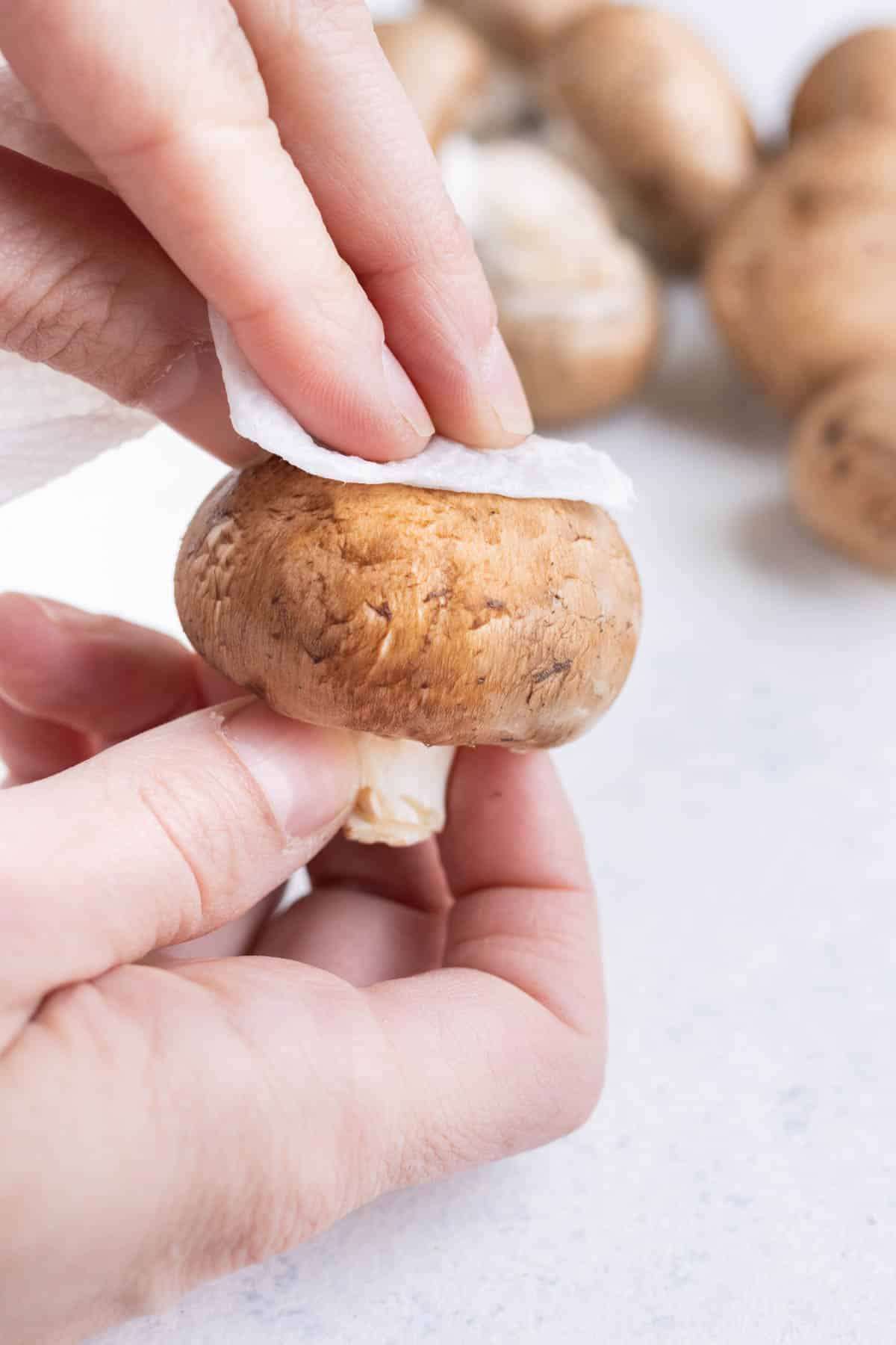 - Wipe with Paper Towel: Place your fresh mushrooms on a dry, clean surface, and wipe the caps and stems off with a damp paper towel. If you want to reduce time, you can use a sharp knife to remove the stems.