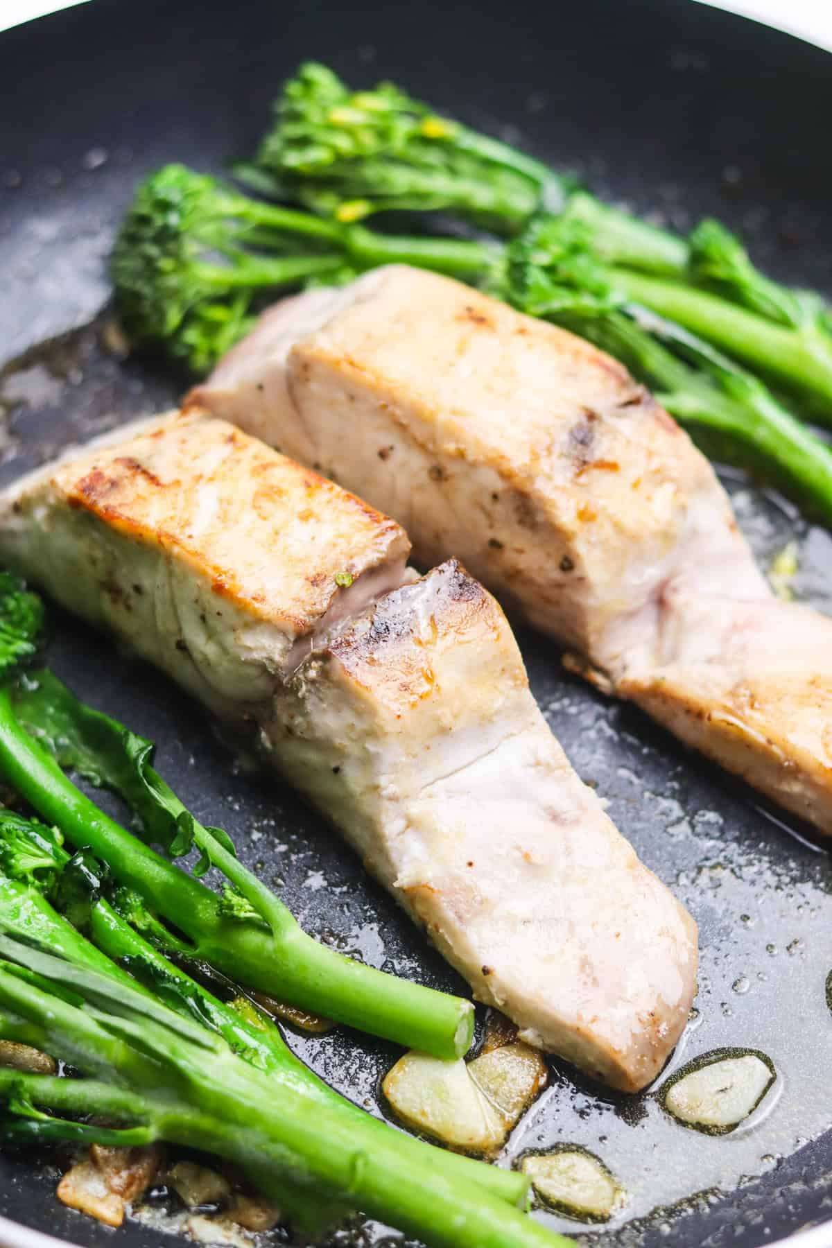 - Set a non-stick skillet to MEDIUM-HOT. Melt the butter and add the sliced garlic and sea bass skin-side down. Cook for 5 minutes on one side.