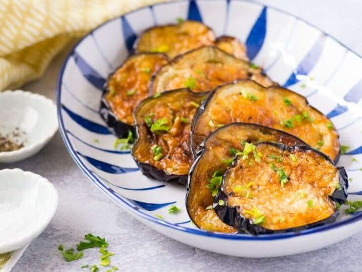 Learn to fry eggplant slices perfectly golden crisp without getting soggy or oil-soaked on ToriAvey.com. Healthier frying method for eggplant.