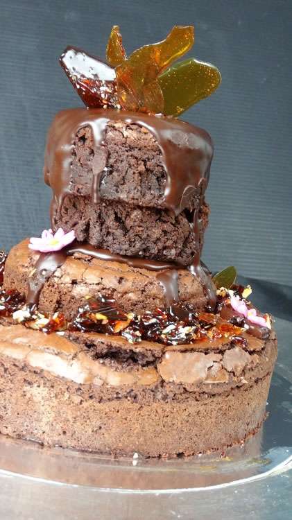 - To secure your brownie tower to the platter or base spread with a bit of ganache and stick on the bottom layer. Keep adding layers and stick together. If they are a bit loose slot a wooden skewer through the stack. Decorate with ganache and flowers or whatever else you like.