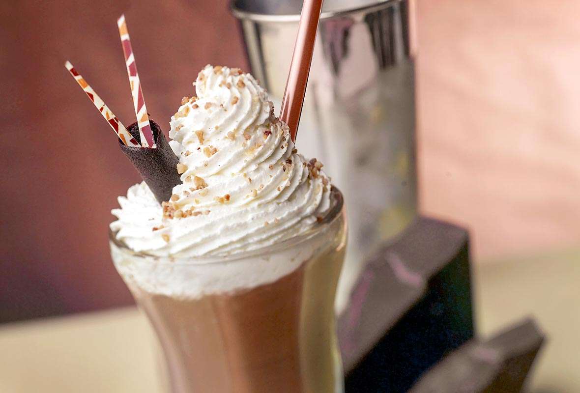 - Pour the milkshake into a tall glass. Either spoon a generous mound of the whipped cream on top or spoon the whipped cream into a pastry bag fitted with a star tip and pipe it onto the milkshake. Sprinkle with the chopped nuts and chocolate curls and stick a straw in it. Originally published April 30, 2009.