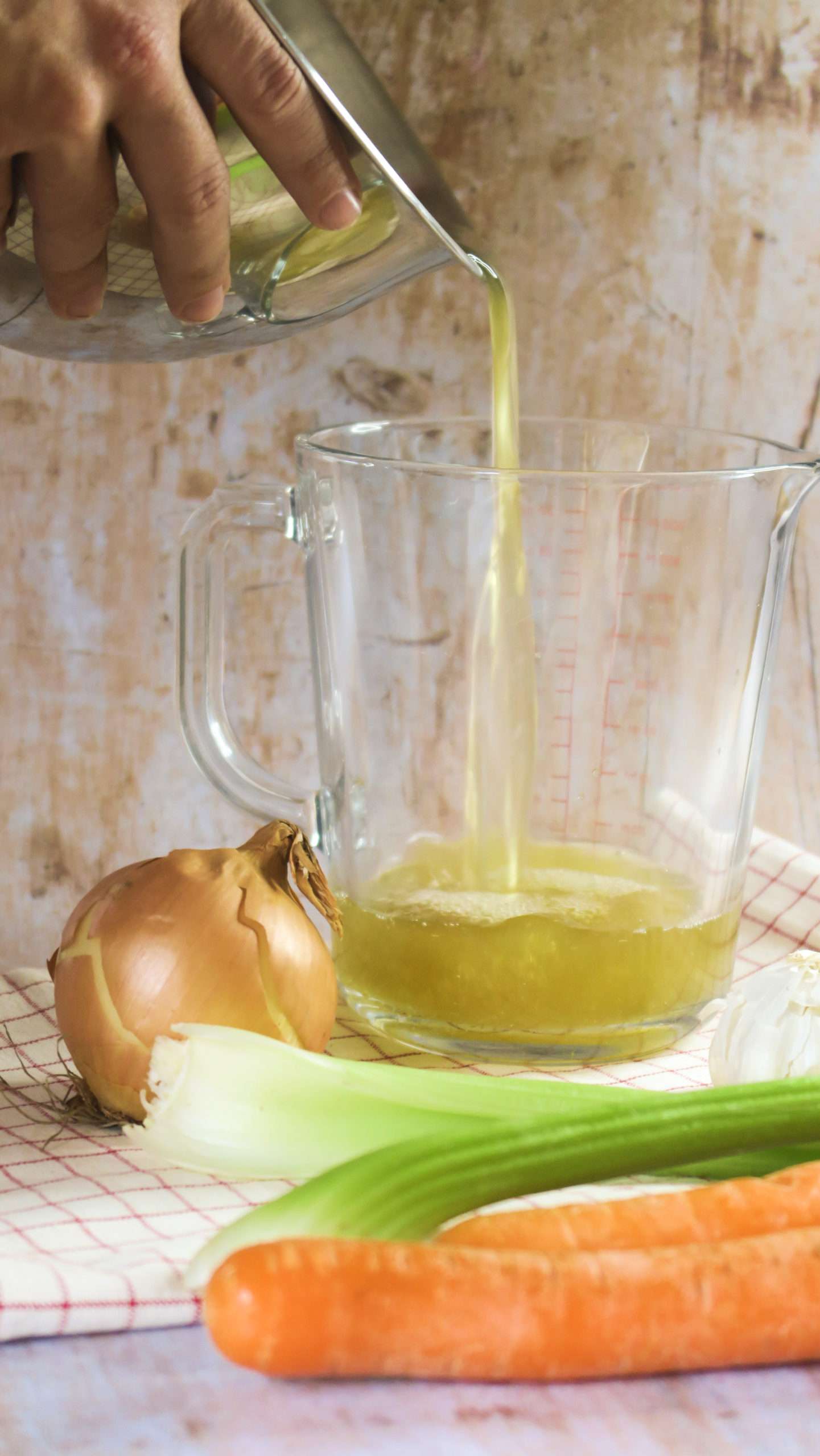 - Strain the stock through a fine sieve into a bowl. You should have about 500 ml of stock. Pour into your jars and leave to cool before refridgerating/freezing.