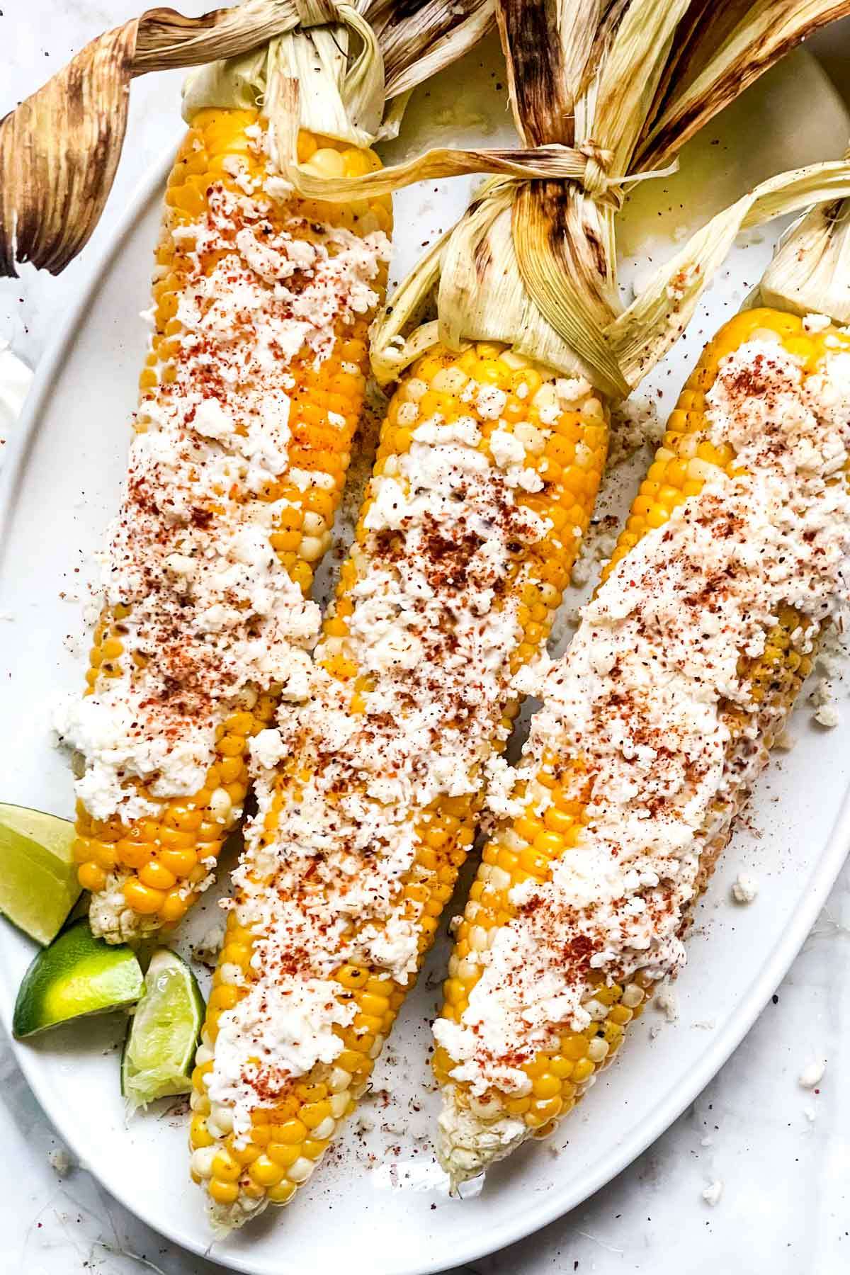 This elote recipe (Mexican corn) features fresh sweet corn on the cob, grilled and slathered in a creamy mayo and sour cream mixture, then topped with lime juice, spices, and cotija cheese for the best Mexican street corn and killer side dish to your favorite Mexican meal.
