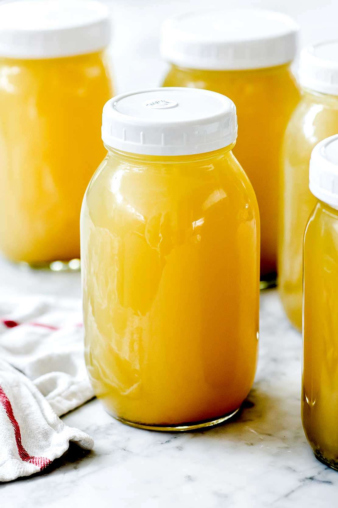 - Turn off the heat and allow the stock to cool or if using immediately, fish out all of the bones, veggies and herbs, and discard. Place a large colander over a Pyrex 4 cup glass measuring cup and slowly drain the stock from any straggling aromatics so the colander catches anything that may fall from the pot. Then, use a fine-mesh strainer to strain the stock into your next recipe's soup stockpot. Or, if storing to use later, strain into 1 quart wide-mouth glass canning jars and cool before adding a tight fitting lid. Refrigerate for up to 5 days or freeze in gallon bags for up to 6 months.