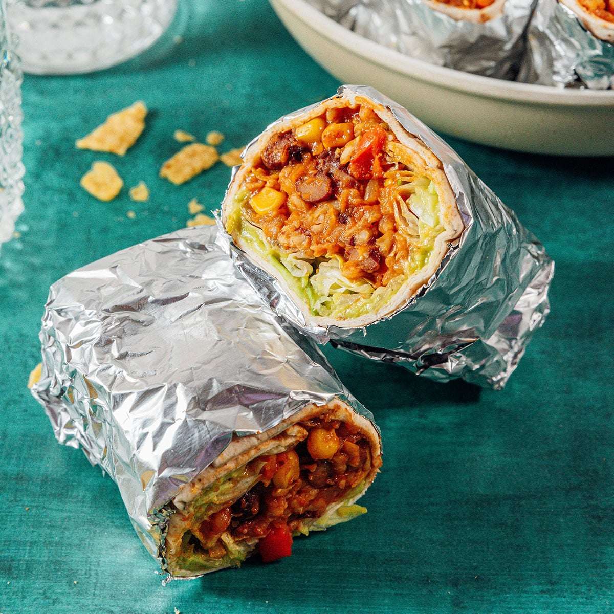 - Assemble: Spoon filling onto your tortilla, along with your desired additional fillings (we did guacamole and lettuce). Fold the sides over then roll into burritos.We found this to be easier if you roll the burrito on top of a piece of aluminum foil. Once you roll the burrito, wrap it in foil before cutting in half. This will hold everything together, no matter your burrito rolling skills!