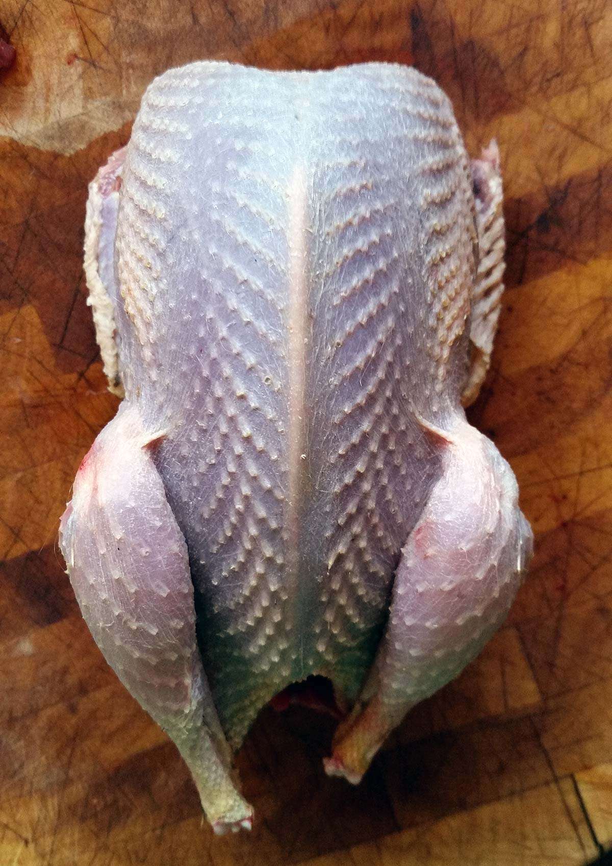 - I snip off the Pope's nose, the tail, and then snip upwards to the breastbone to make a hole large enough for my hand, or at least a finger in the case of quail, to get inside.