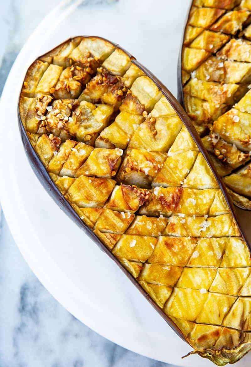 - Slice the inner side of the eggplant halves across on a diagonal one way, then slice across the eggplant the opposite direction, making a diamond pattern. This allows the heat to get into the eggplant deeper and get a richer roasted flavour.