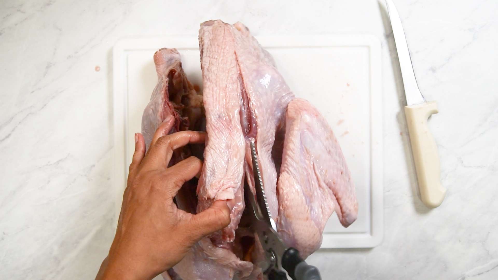 - Next, use your hands to pull the turkey apart, as shown in the images above, and in the video.