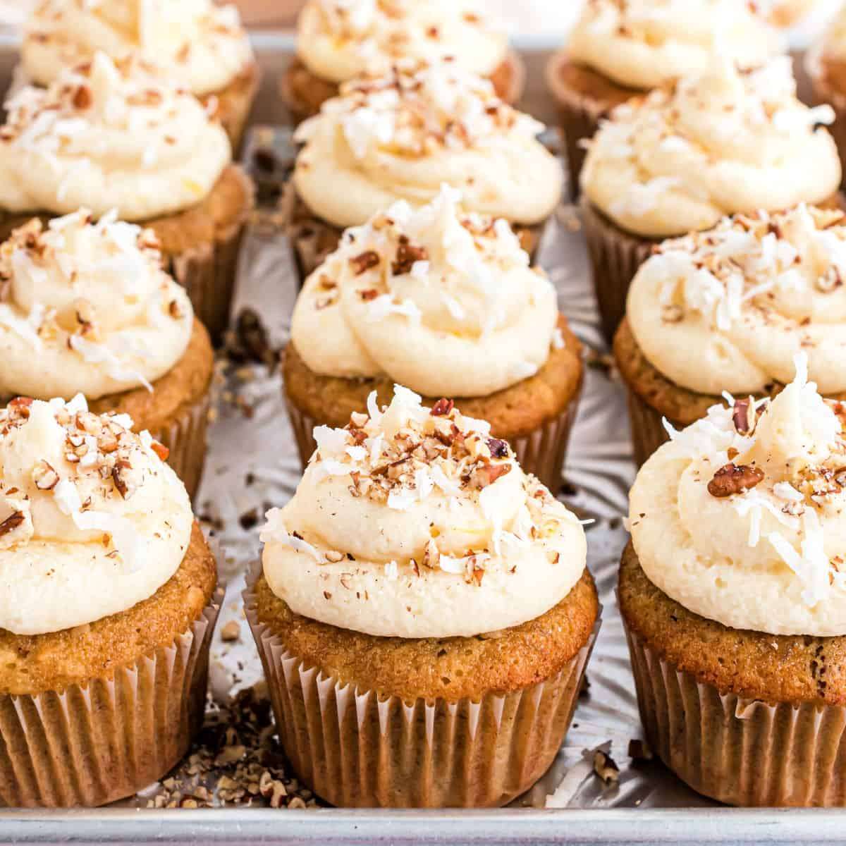 - After chilling, pipe frosting (using a large open tip, or knife to spread) onto cupcakes. Sprinkle with coconut and chopped pecans.