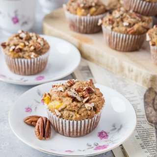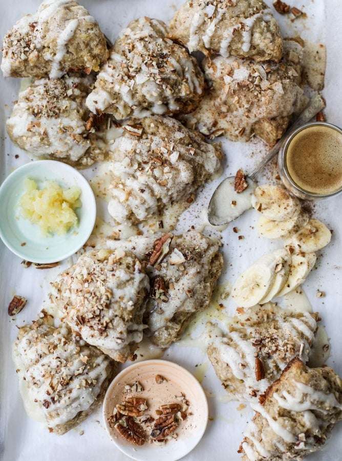- Top the scones with the mascarpone glaze, toasted coconut and toasted pecans and serve!