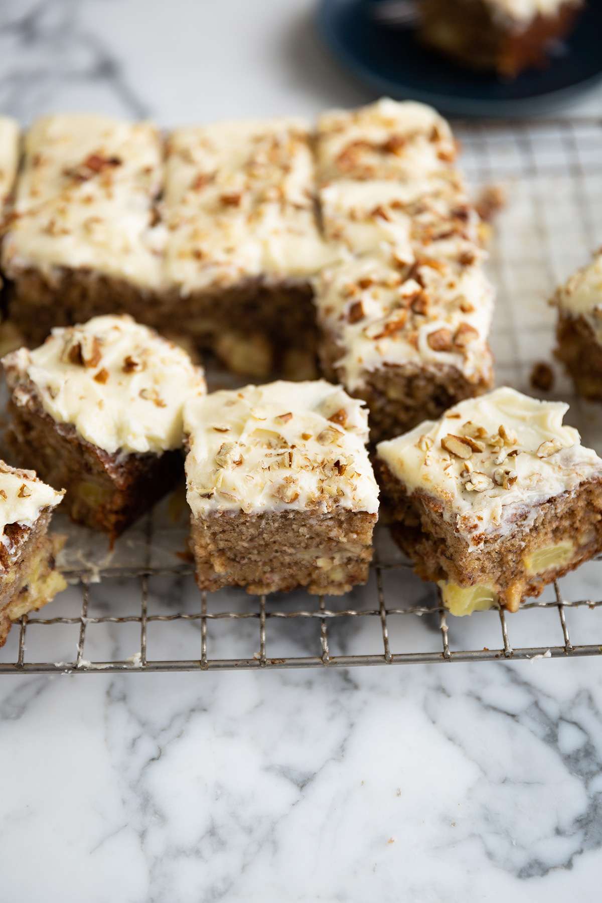 - To make the cream cheese frosting/icing, beat all of the ingredients together using an electric mixer until light and fluffy and ice your cooled cake. Finely chop up a few extra nuts and scatter them over your cake to decorate.