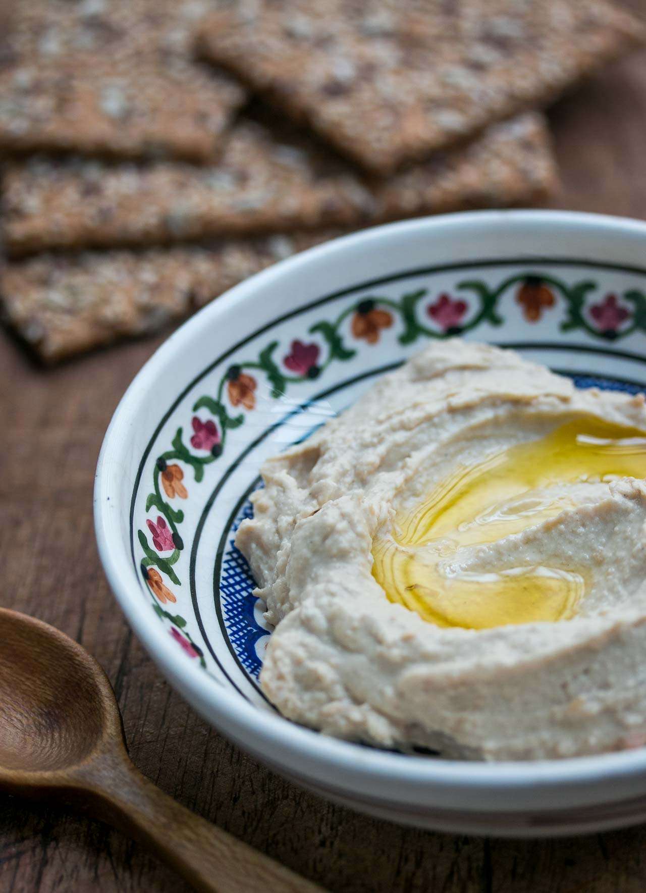 - Serving: I make a well in the center and drip in some good olive oil and add whatever strikes my mood, from red pepper flakes to za’atar. Chopped toasted nuts are nice, such as hazelnuts, as are seeds or fresh herbs. Serve with toasted pita chips, baguette slices, raw vegetables or whole wheat crackers.