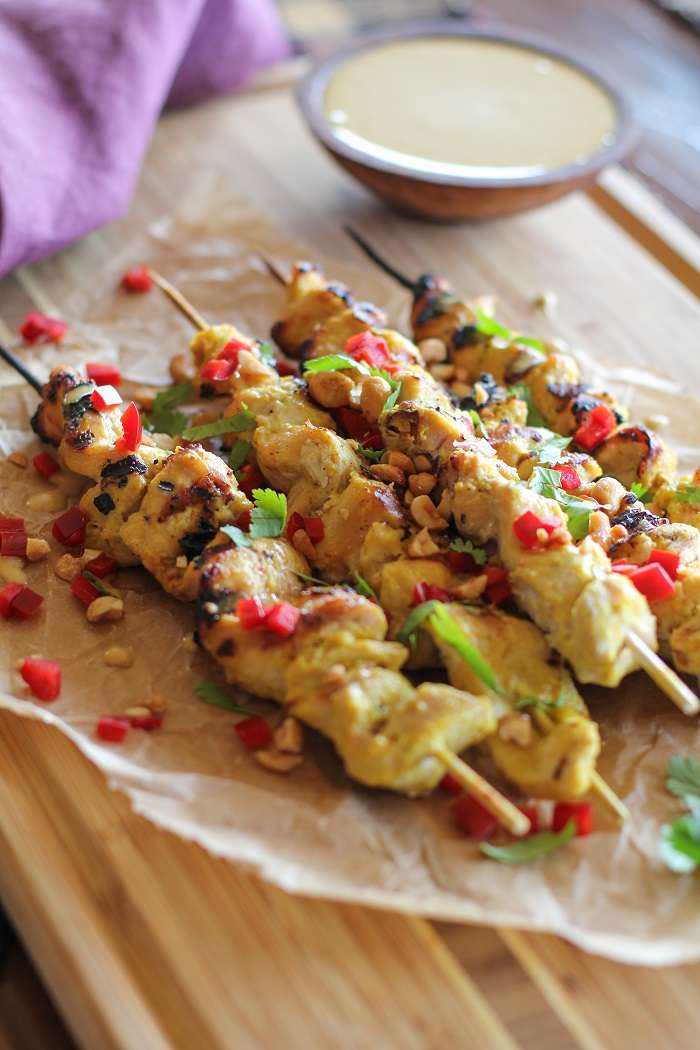 - Transfer chicken skewers to a serving platter and serve with chopped peanuts, fresh cilantro, and peanut sauce.
