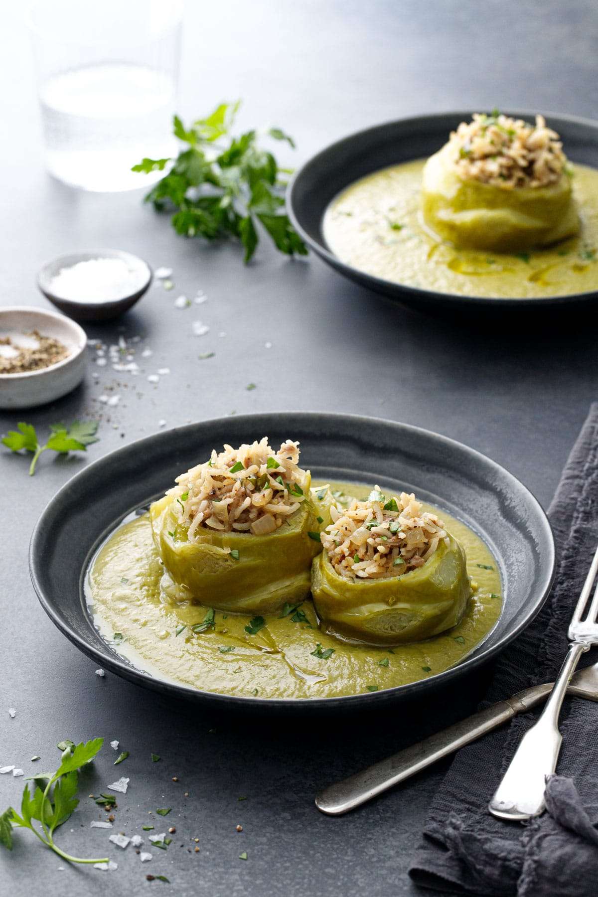This traditional Hungarian dish features tender bulbs of kohlrabi stuffed with a flavorful pork and rice filling, and served alongside a kohlrabi soup made with the leftover scraps and greens.