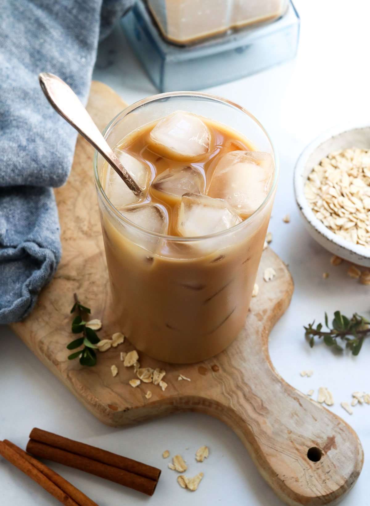 - Pour the mixture into a glass of ice, and enjoy it right away. You can pour this mixture through a fine mesh strainer, on the way into the glass, to catch any pieces of oats that the blender might have missed.