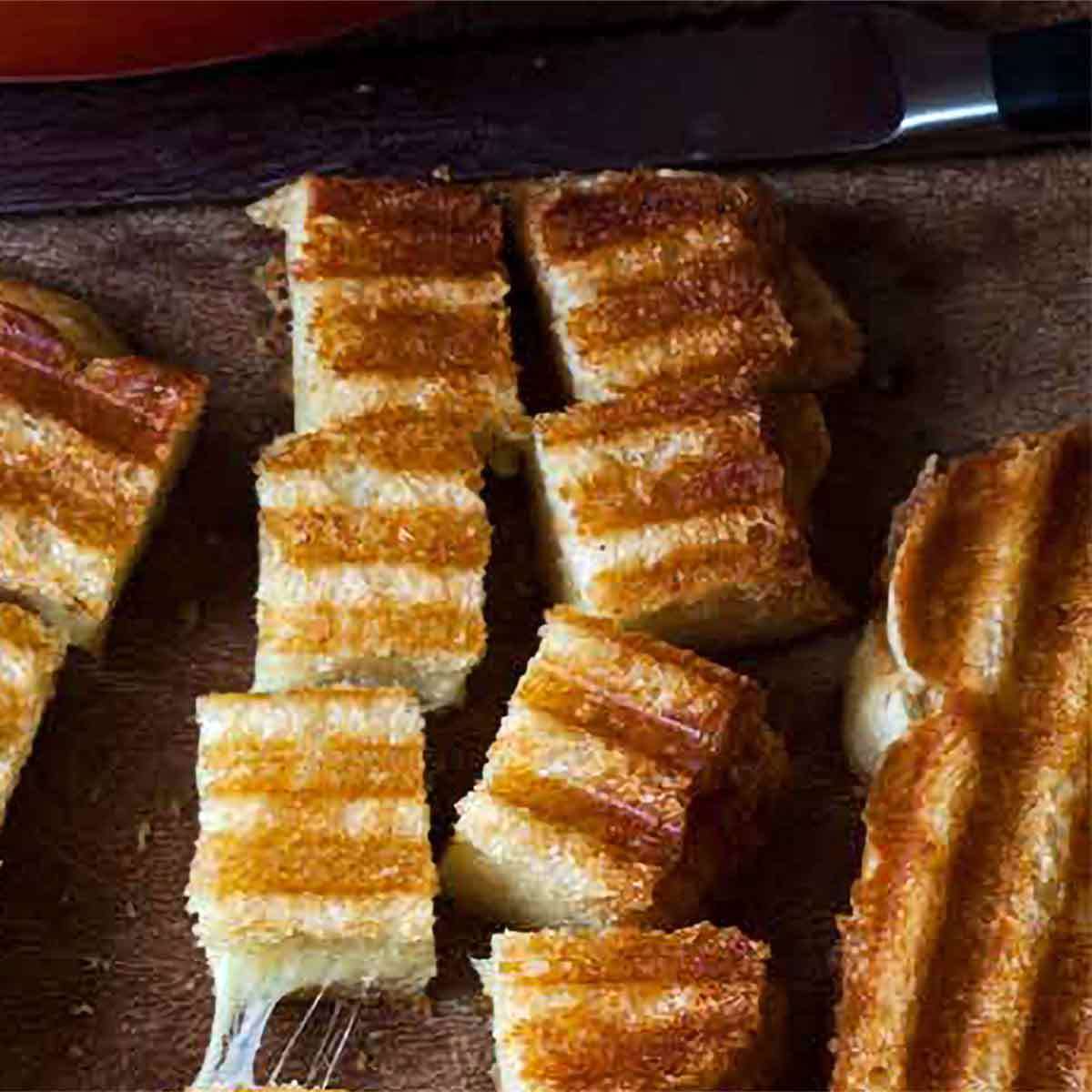 - Cut the grilled cheese sandwiches into approximately 1-inch croutons. Dunk them into soup, being mindful that if you don't care for soggy grilled cheese, you're going to want to add just a couple croutons at a time to your bowl of tomatoey goodness.