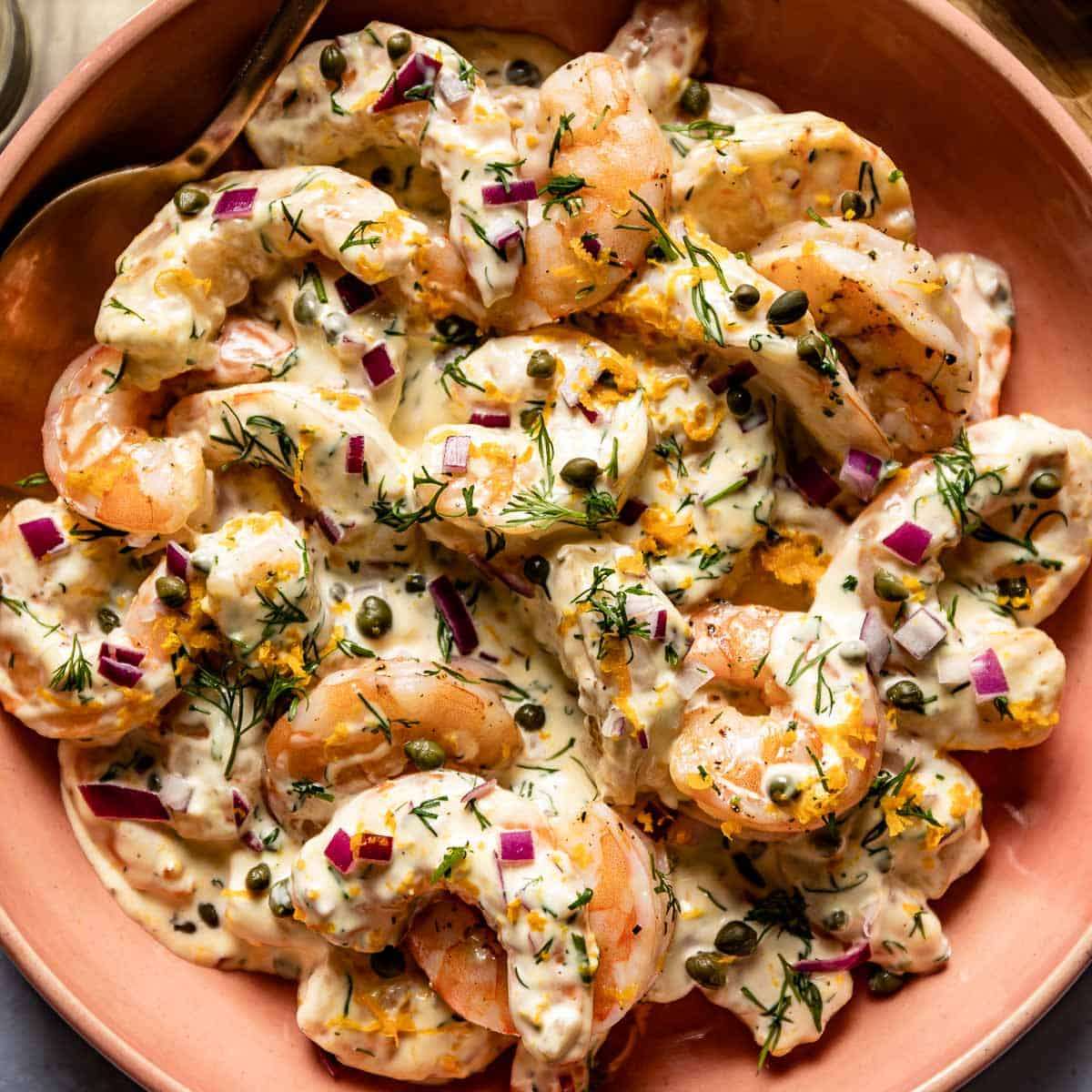 - Toss, rest and serve: Pour the dressing over the shrimp and toss to combine. Cover with stretch film and let it rest at room temperature for 30 minutes before serving.
