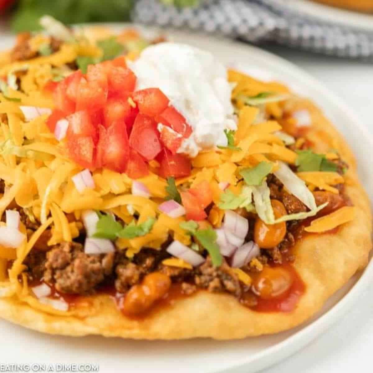Indian fry bread tacos are served on crispy and delicious bread. They are loaded with flavorful ground beef and all your favorite toppings.