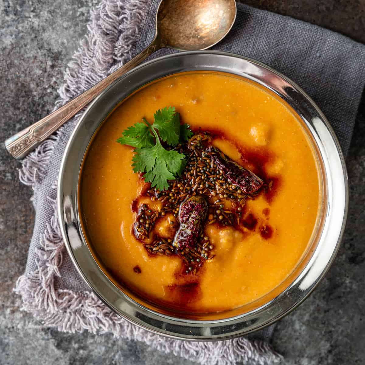 - Either keep the lentil soup chunky or use immersion blender (blending stick) or high speed blender to puree until smooth. Add cooked turkey to the lentils. Stir to incorporate and continue to cook another 10 minutes. Ladle into soup bowls and pour tadka over each.