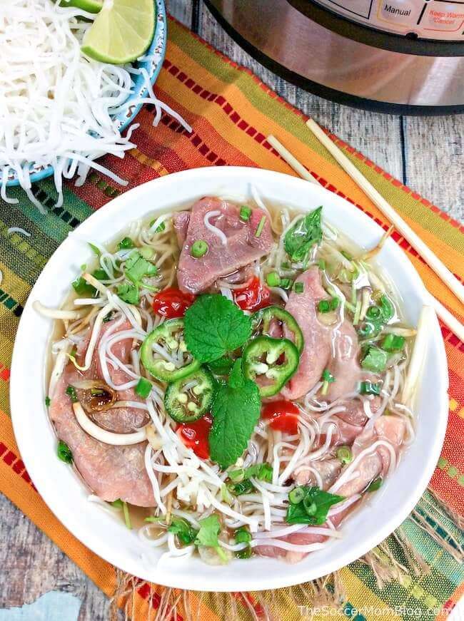 This Instant Pot Beef Pho is a quick and easy copycat of the classic Vietnamese soup! Instead of spending all day simmering on the stove, this rich and flavorful broth is ready in about an hour!