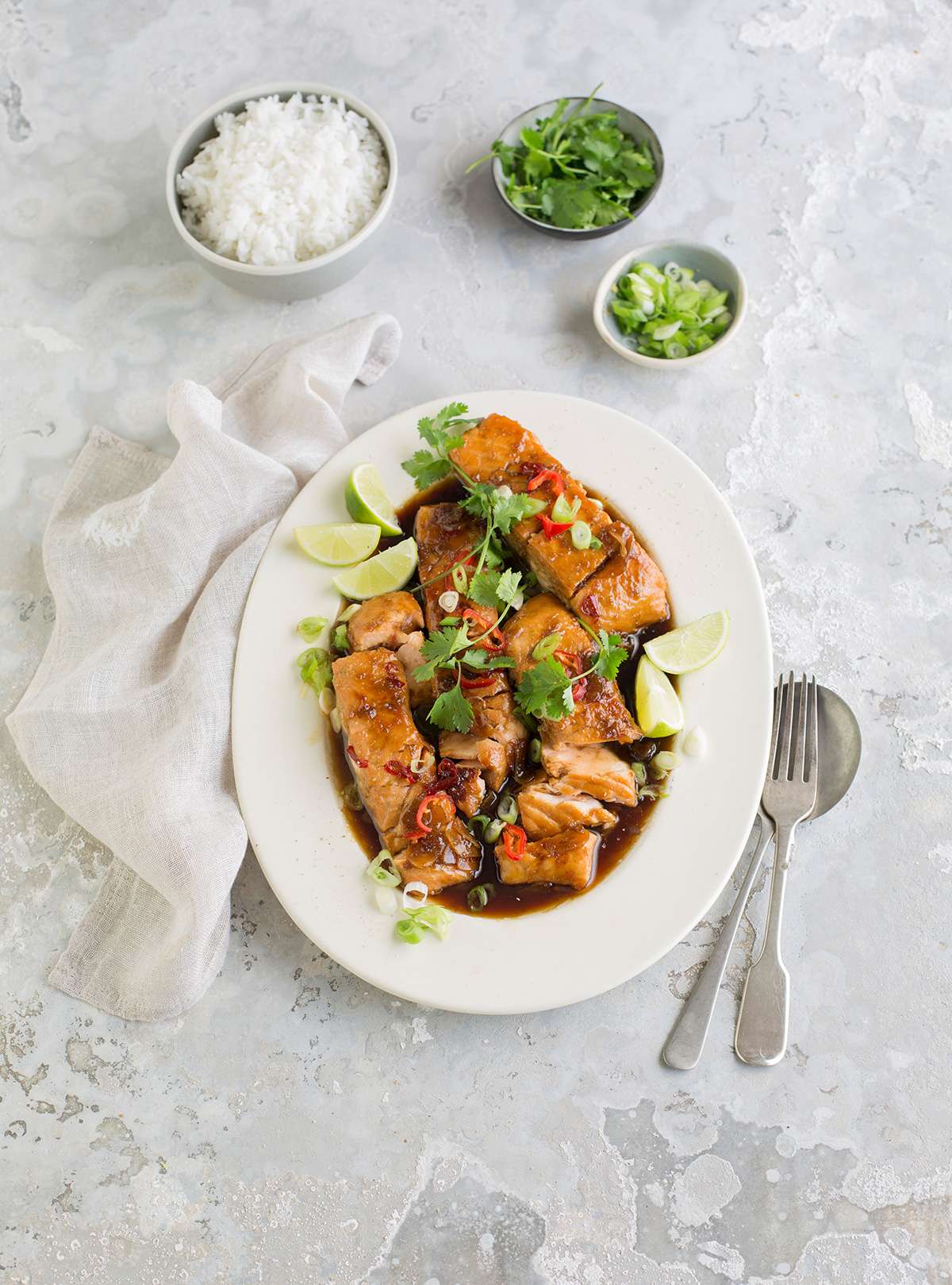 - Remove the pieces of salmon carefully and arrange flesh side up on a platter. Put the inner pot with the sauce back into the Instant Pot and heat on the Sauté function. Cook the sauce for a minute and until the sauce has thickened. Spoon this over the salmon and garnish with sliced spring onions, fresh coriander and additional lime wedges.