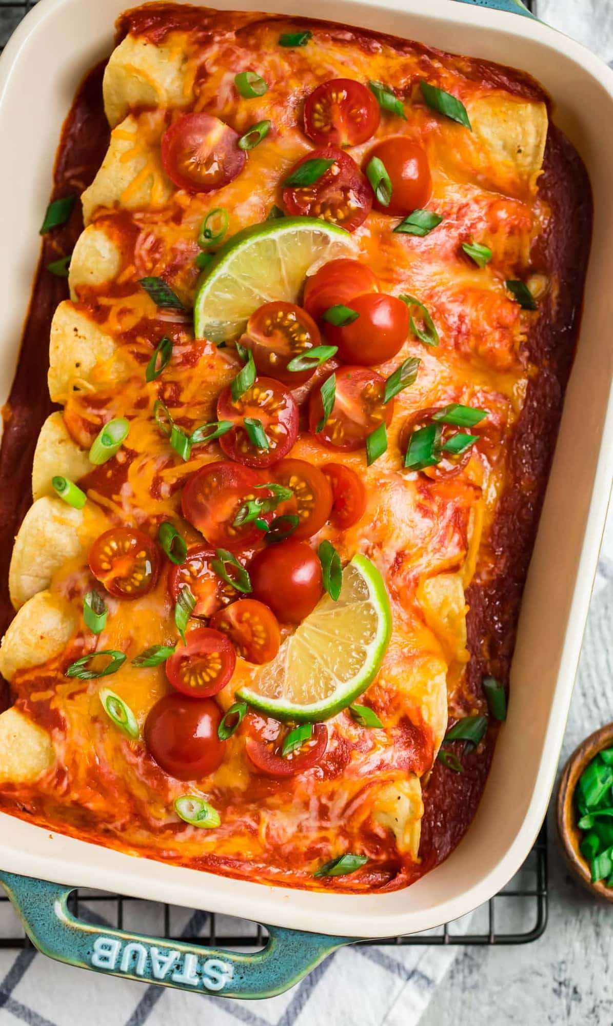 - TO MAKE AHEAD: These enchiladas can be assembled and stored unbaked in the refrigerator for up to 1 day or frozen for up to 3 months. Add the red sauce and cheesy topping right before baking so they don't become mushy.