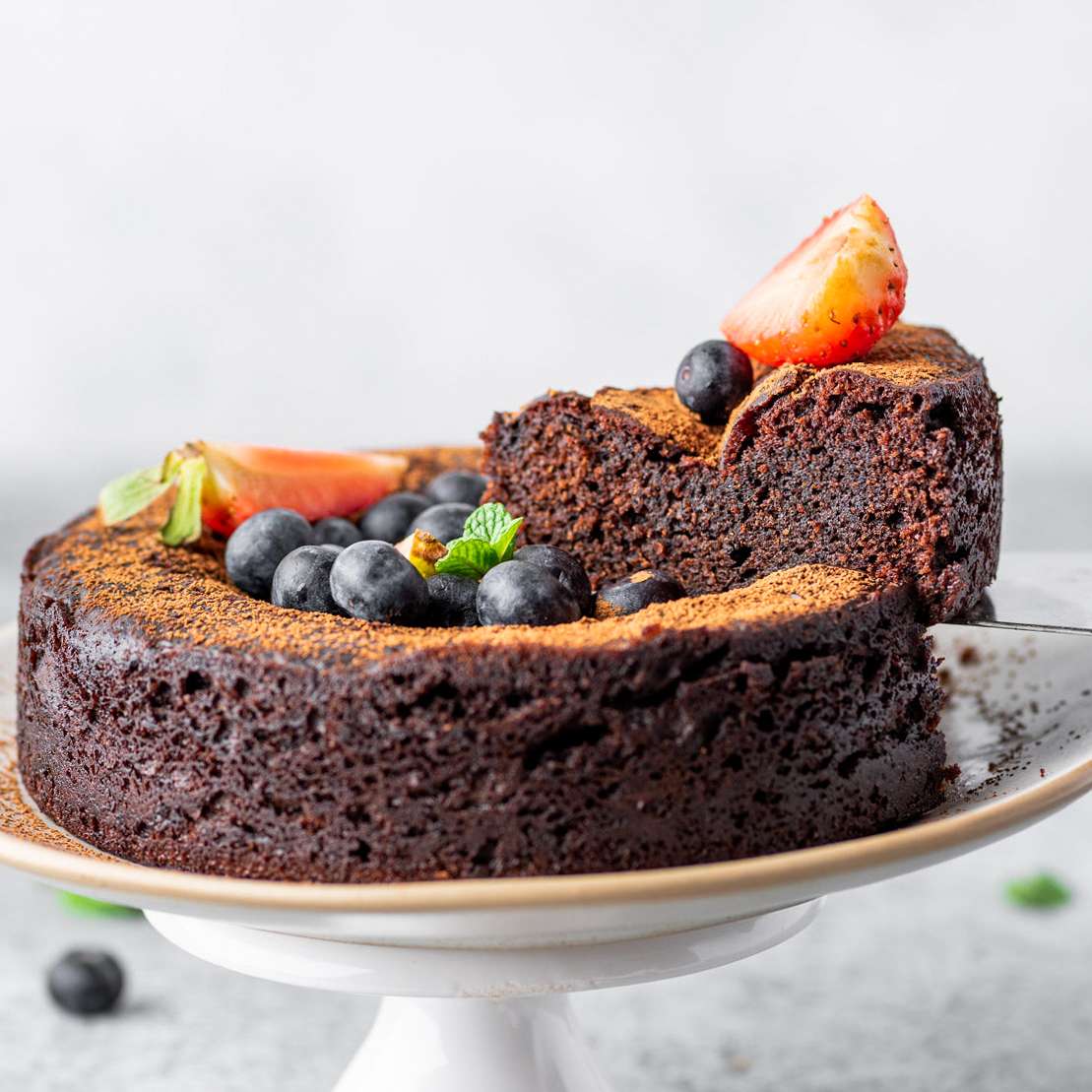 - Dust some cocoa powder on top of the cake and decorate it with berries. Serve the slice of cake with whipped cream on top.