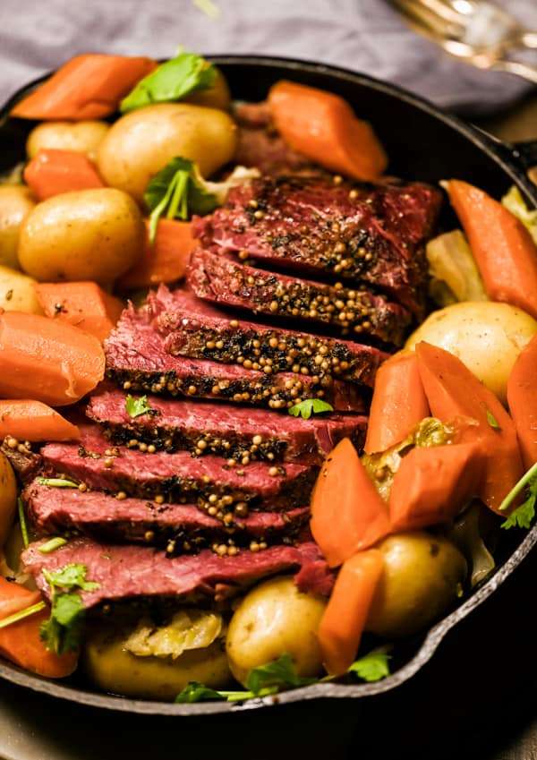- On a serving plate, cut the corned beef against the grain. Add the vegetables to the plate and serve immediately!
