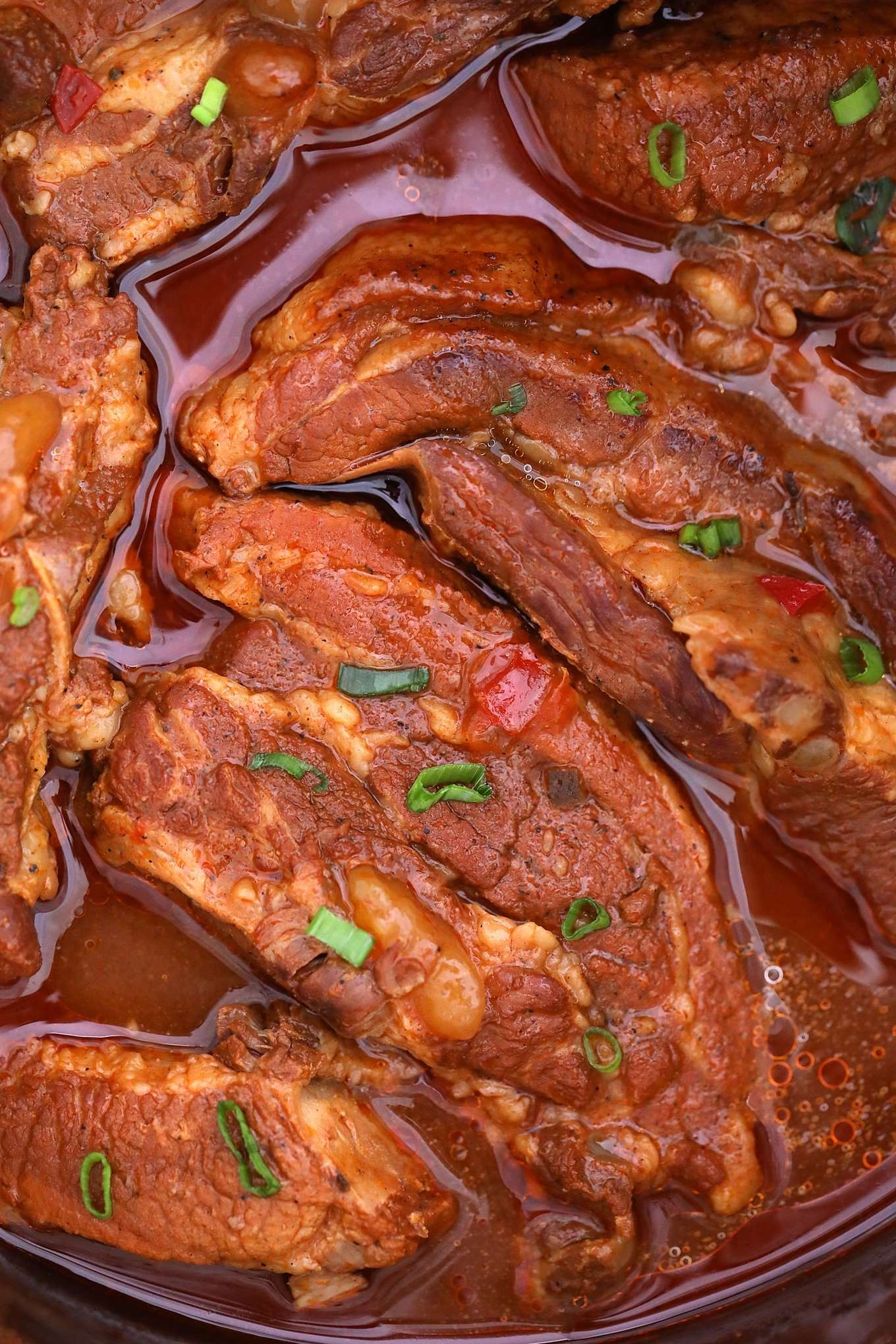 - Add the ribs to the Instant Pot and pour over the BBQ sauce.