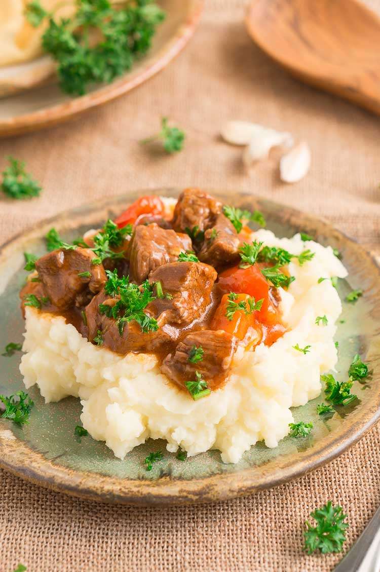 - In a small bowl, combine arrowroot starch & several tablespoons of the goulash liquid to create a 'slurry'. When it's mixed well and smooth, add back to the Goulash, and stir everything while still hot. Stir constantly until the sauce thickens. (you want a gravy consistency). Serve over mashed potatoes, mashed cauliflower, pasta, or zoodles.