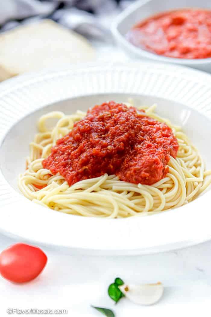 Instant Pot Marinara Sauce tastes tastes rich and robust like it has been simmering all day but is ready in about an hour in the Instant Pot pressure cooker.