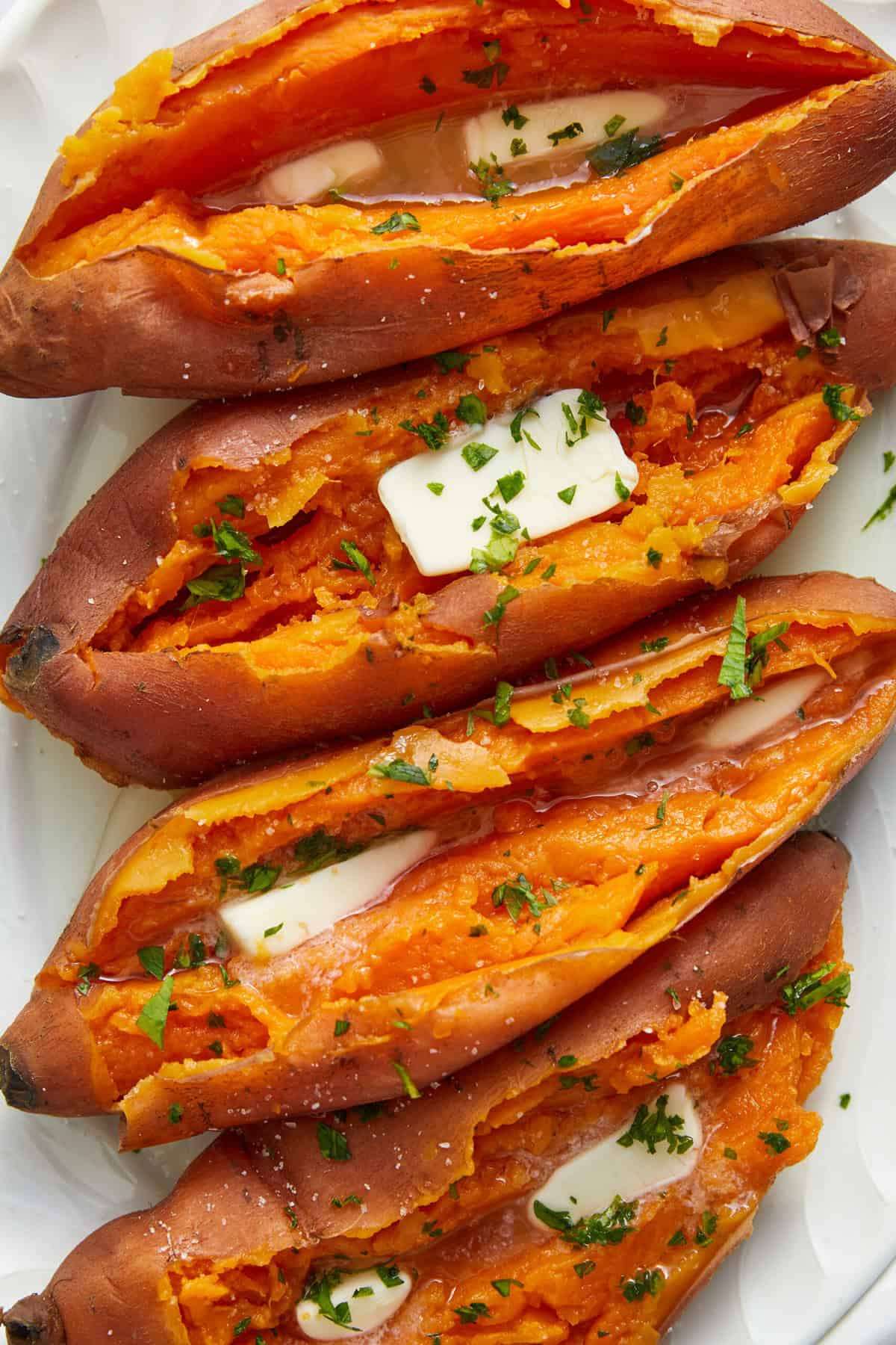 - Remove the sweet potatoes once done. Slice them open down the middle and sprinkle with salt, pepper and parsley. Spread butter and any other toppings you prefer on the potatoes before serving.