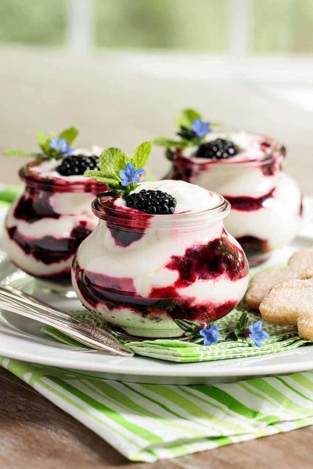 - To finish: Layer the blackberry syrup and the cream mixture in 6 clear glass bowls, jars or glasses (¾-1 cup). Garnish with fresh berries and mint leaves