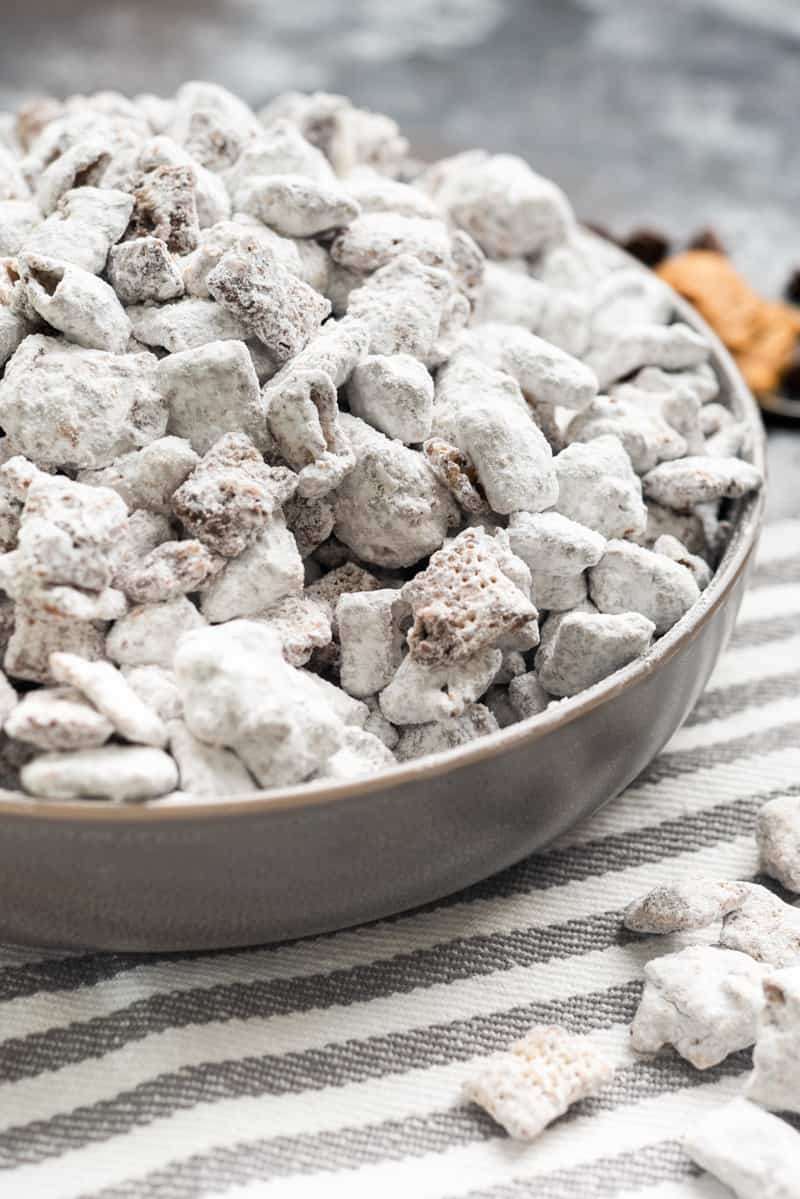 Rice cereal coated in melted peanut butter and chocolate, dusted in powdered sugar — you won’t be able to resist muddy buddies! This classic snack is so easy to make and deliciously addicting.