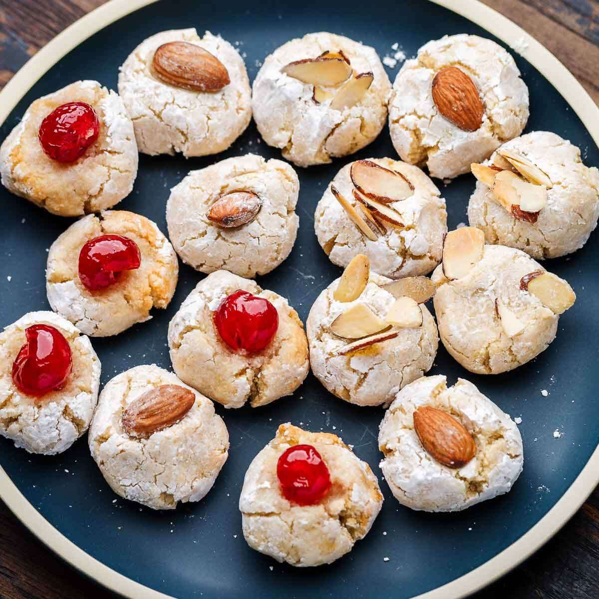 - Place the dough ball onto the cookie sheet, leaving 2 inches between each cookie. Press a whole almond or cherry into the top of the dough ball. Alternatively, press down and leave empty or coat with sliced almonds.